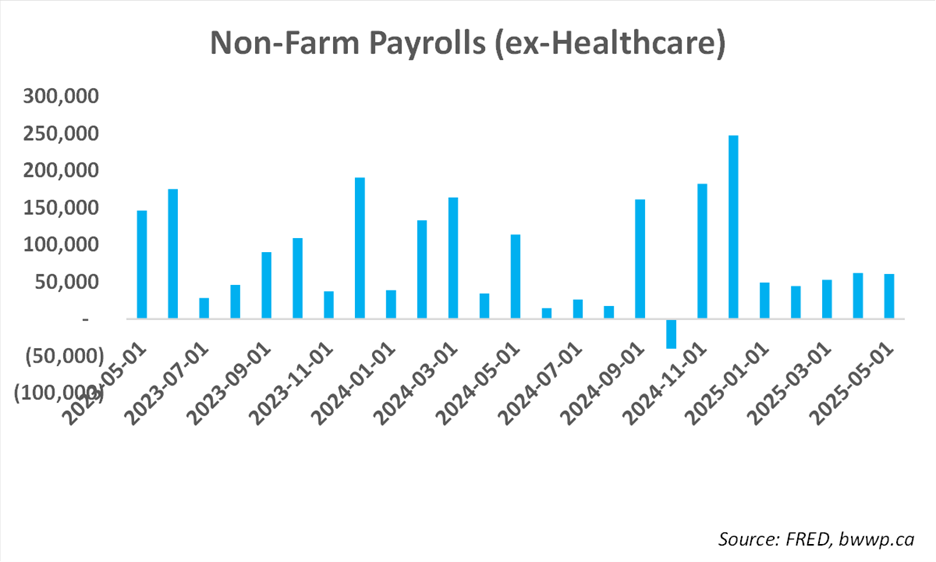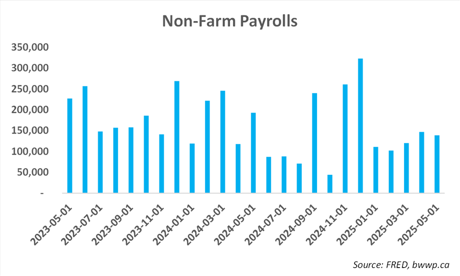 Jobs have stayed pretty steady between 100-150k, which is a bit below what experts believe is “steady state” for the U.S. job market. This steady state figure is often thought to be between 150-200k and represents the number of jobs the U.S. economy needs to generate each month such that the unemployment rate does not rise. However, while current levels are below this, the steady state may, in fact, be lower given the mass deportations the Trump Administration is undertaking, which has effectively lowered the pool of available labor. In other words, the jobs picture may be better than current numbers suggest. On the flip side, there is this: