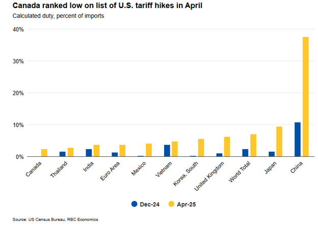 Most Canadian exports to the U.S. remain exempt because of CUSMA. In fact, RBC Economics estimates that ~86% of Canadian exports to the U.S. are currently exempt and while the tariffs on the remaining ~14% (steel and aluminum the big ones) bring the overall blended tariff to ~2.3% on all goods, this remains well below the levels for most other trading partners. This could change post the end of the 90-day pause but given Trump’s proclivity for backing off after making threats, we would argue the base case is that overall tariffs on Canadian goods will remain low.