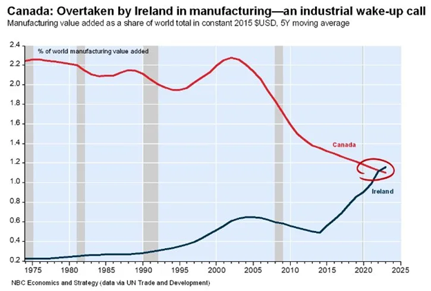 While we are on the subject of Canada, we have harped for a while on the need for a major pivot to attract business to our shores, the chart below captures the difference between Ireland, which adopted a number of pro-business policies, including significantly reducing its corporate tax rate beginning in 1997 (it is now 12.5%), and Canada, which has taken a decidedly less pro-business approach: