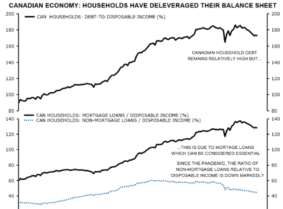 Considering that Ireland has 1/8th the population of Canada and limited natural resources when compared to Canada, the above shift is even more stark. Okay, let’s give a bit of good news on the Canadian economy. Much has been written (including by us) about the indebtedness of the Canadian consumer. Let’s look at a chart that has two panes and then comment: