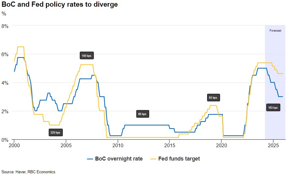 An increasingly pronounced gap in economic performance warrants a divergence in expected monetary policy by the Bank of Canada and the US Federal Reserve