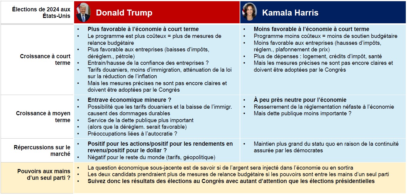 Élections américaines – Le 5 novembre 2024, des millions d'Américains iront voter pour choisir le prochain président des États-Unis. Les chiffres des sondages semblent suggérer que la course reste serrée et qu'elle sera probablement finalement décidée par seulement quelques milliers de votes dans une poignée d'États charnières. Quel sera l'impact d'une présidence Trump ou Harris sur l'économie et les marchés? Ça dépend si les élections aboutissent à un Congrès uni ou divisé. Un Congrès uni pourrait signifier que les mesures de relance budgétaire seront amplifiées par les deux parties, tandis qu'un Congrès divisé limitera l’élan budgétaire. Nos collègues de RBC Gestion mondiale d’actifs ont dressé le tableau suivant qui résume les perspectives de croissance économique à court et à moyen terme sous les deux présidences, ainsi que les répercussions sur les marchés.