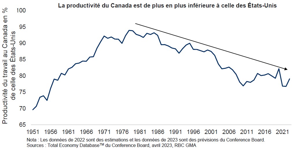 Quel effet un dollar plus faible aura-t-il sur la productivité du Canada? Le retard du Canada en matière de productivité est bien documenté – Une discussion sur les économies ne peut être complète sans aborder le sujet de la productivité. La productivité du Canada par rapport à celle des États-Unis est en déclin depuis la fin des années 1980 et a été particulièrement durement touchée par la bulle technologique du début des années 2000. Une partie de l'explication réside dans les différences sectorielles entre les deux économies; l’économie canadienne dépend davantage des ressources naturelles, dont les taux de croissance de la productivité sont souvent inférieurs à ceux des secteurs plus évolutifs comme la technologie, dont les États-Unis possèdent davantage.