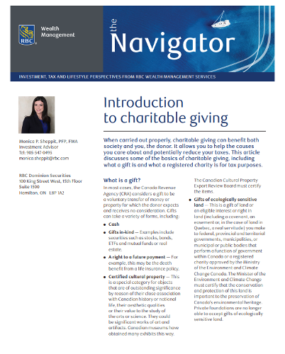The RBC Wealth Management Charitable Giving Program is an effective tax management and estate planning tool that we can help incorporate in your financial plan. Through the program, you contribute to an individual charitable gift fund, which you can name. We will then help manage your charitable gift fund, which is administered by Gift Funds Canada, an independent, non-profit charitable organization.