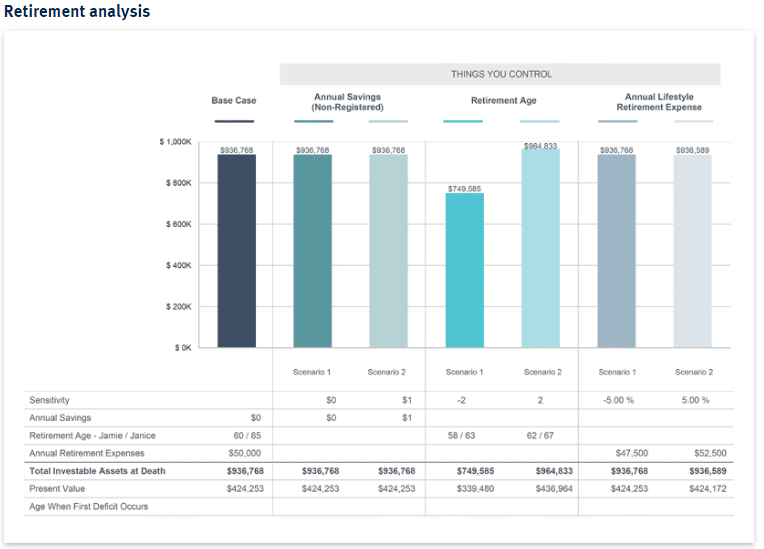 It is impossible to know for certain what will happen tomorrow. To provide a financial projection, however, certain assumptions about what will happen in the economy have to be made. But what if some of those assumptions prove to be wrong? What if, for example, you were forced to retire early? Or perhaps you end up spending more in retirement. The myGPSTM Retirement Analysis allows you to independently change the assumptions you have made about the future to see how that change will affect your overall finances.