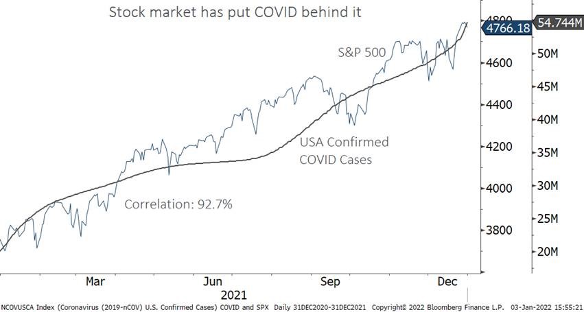If we had to go back and think of 2021 predictions, we are pretty sure none of them said that the amount of confirmed COVID cases in the U.S. would more than double and stocks would put up strong returns – at least not both in the same prediction! That is what happened as the stock market, forward looking as ever, seems to have put the COVID-19 crisis behind it and is forecasting better days ahead. While the initial reports of the Omicron variant (coupled with talk of higher interest rates from the Federal Reserve) triggered some volatility in November, the S&P 500 ended the year just off of its record high. This performance largely stems from the view that another round of lockdowns is highly unlikely in the United States, and were it to come to that, we think these lines would start to diverge.