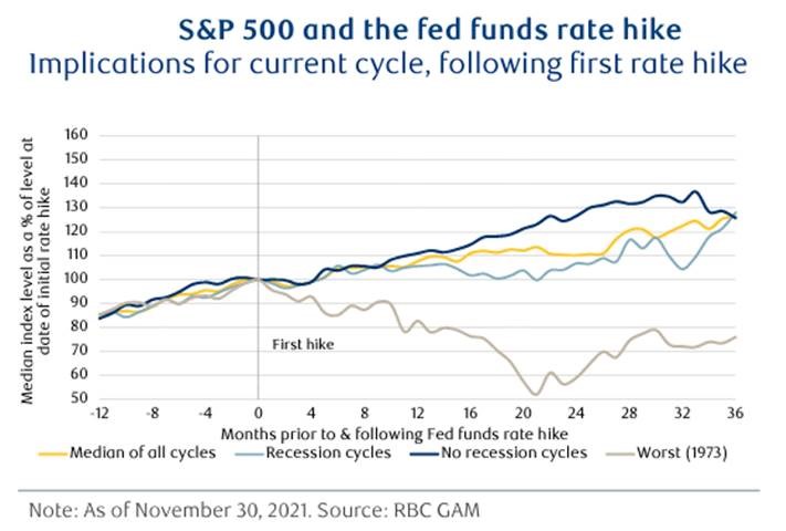 With a high likelihood of higher interest rates this year, central banks are topping a lot of investors’ worry lists. The funny thing is, it is rarely the thing most people are worried about which cause the biggest problems. It is almost always the event that nobody saw coming that provides the biggest jolt to markets. Unpredictability is part and parcel of equity investing, and it is that higher level of volatility that allows us to earn higher returns. We often call living through corrections the “price of admission” for earning the historically superior return from equities versus bonds or cash. While there are some rare years where the admission is waived and stocks take a steady ascent, we go into each year assuming that is not going to happen. We think the combination of expected strong economic and earnings growth, valuations that were tamed in 2021 and historical trading patterns around Fed rate increases all bode well for 2022, but we know that it is how we react to the unexpected which will determine our success as investors.