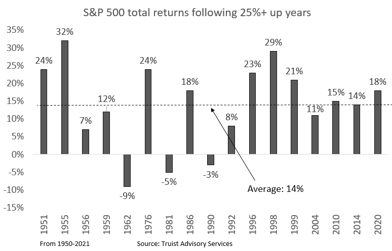 Human nature being what it is, many investors have an instinctual impulse to take money off the table after a string of healthy returns, such as those delivered in 2021. We completely understand this urge, but the empirical data suggests holding tight is the more profitable strategy. In years following 25% total returns for the S&P 500, the index was up 14% on average the following year, with only three losing years, two of which were accompanied by our old nemesis, economic recessions. In the event the economy continues to grow (the overwhelming view for 2022) investors are typically better off sitting tight.