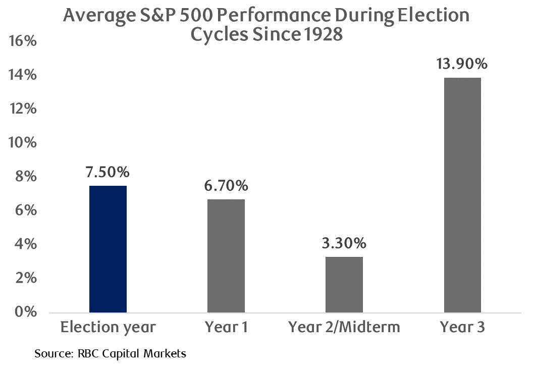 - Election years also tend to follow a well-defined trend of early year choppiness, strength through the summer, softness into election day and a rally thereafter.