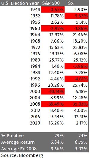 Looking at the data above may elicit a “so what” in that election year returns don’t see anything particularly extraordinary one way or the other. That story changes a bit when we look at the “batting average”, or what percentage of the time returns are positive. Over the long term, The S&P 500 and TSX rise about 70% of the time. The U.S. sees a meaningful bump higher in the election years since WW2, with gains 79% of the time, and returns around the long term average as detailed above. If we take out the significant outlier of the Great Financial Crisis of 2008, the average return in both the U.S. and Canada jumps above 9%.