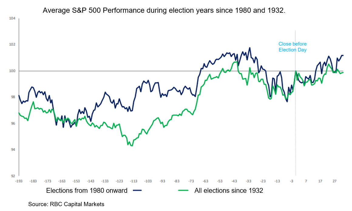 - Historically markets have seen returns in line with long-term averages in Presidential election years, but with a higher probability of a positive return.