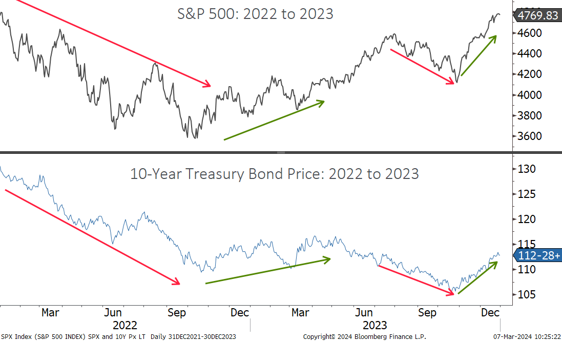 Since the calendar turned to 2024, stocks have maintained their momentum but bonds have faltered somewhat as markets push out their expectations for the timing and magnitude of interest rate cuts. In 2022 and 2023, such a move in bonds would have presented a strong headwind for stocks. That has not been the case in 2024, as seen below.