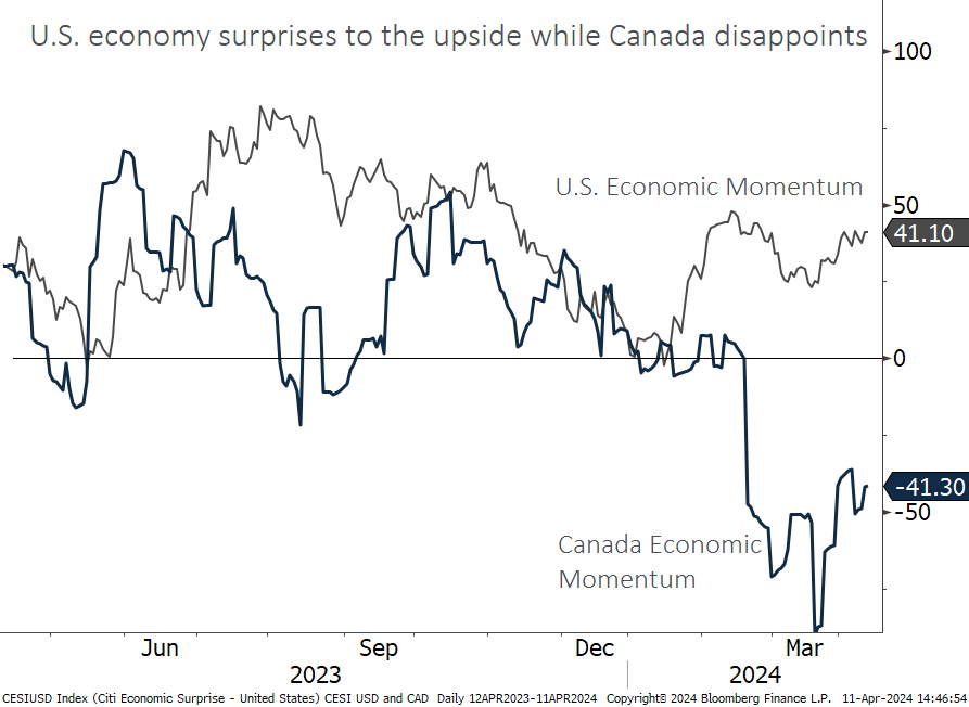 For the past few years, we have seen the U.S. economy and stock market’s performance cast a significant shadow on Canada. The U.S. continues to eclipse Canada in one other important factor, and that is in the currency market. The Canadian dollar has lost about 3% versus the U.S. dollar in a little over three months this year as the U.S. economy continues to outperform. The chart below measures economic momentum, with readings above zero indicative of an economy outperforming expectations, and readings below zero the opposite. A stark gap has opened up in 2024, with the U.S. doing quite nicely while Canada has seen some more troubling signs.