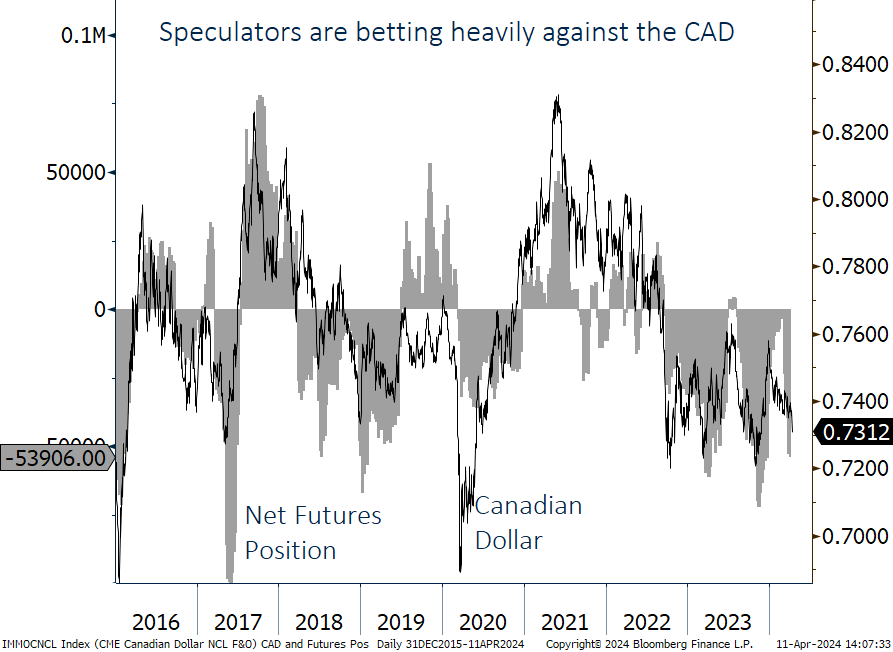 Speculators are leaning against the Canadian dollar, often a contrary short-term signal