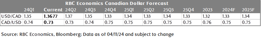 This has changed the outlook on interest rates, with markets now expecting the Bank of Canada to cut rates before the Federal Reserve. RBC now sees only one Federal Reserve rate cut this year, coming in December, while June remains a possibility in Canada. As oil prices have had less of an impact on the Canadian dollar, expectations for interest rates have taken over, and this shift in expectations has worked in the U.S. dollar’s favour this year. If Canada’s economy continues to underperform the U.S., we would expect to see further weakness in the loonie in the medium term.