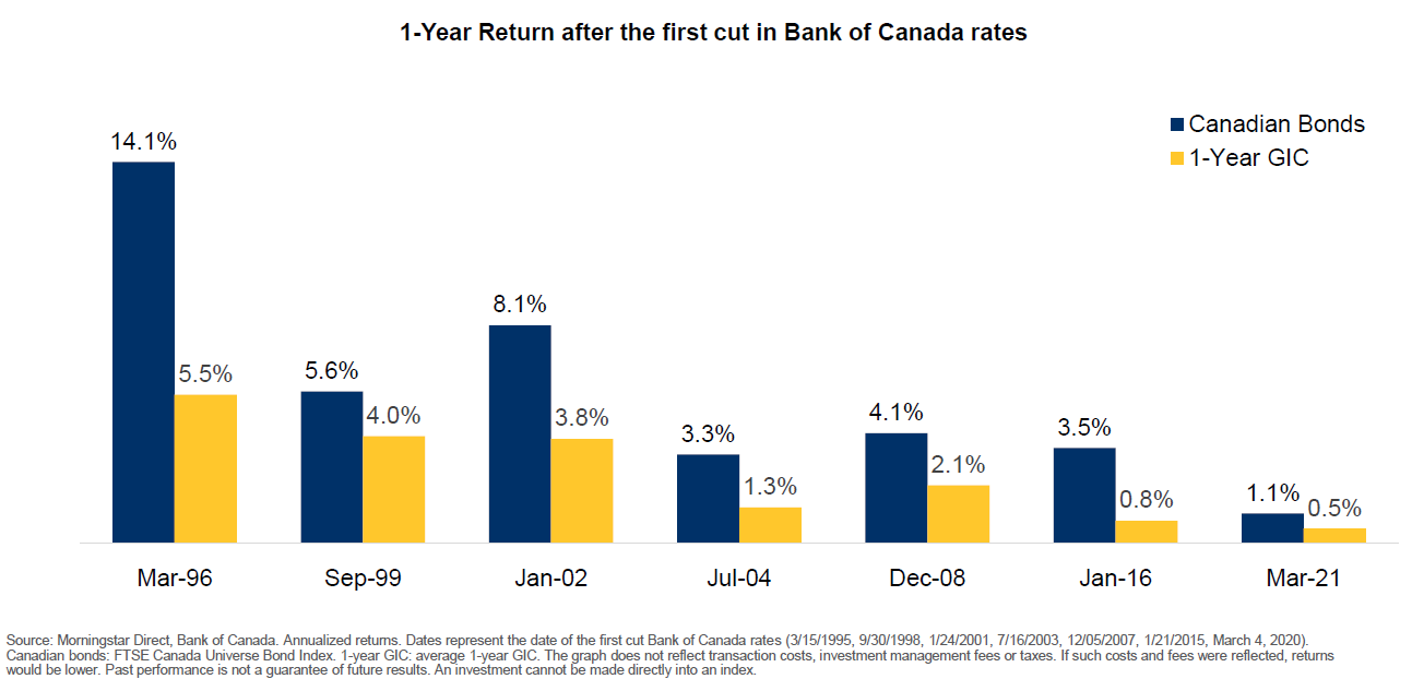 Shifting gears to Canada, we can see below that the Canadian bond market has handily outperformed a 1-year GIC in the first year after the Bank of Canada starts to cut interest rates. We would note that the hurdle rate will be a bit higher this time around as 1-year GICs were in the 5% range when the Bank first started to cut interest rates, but of course bond yields were also higher than they have been during the commencement of the past few rate cutting cycles.