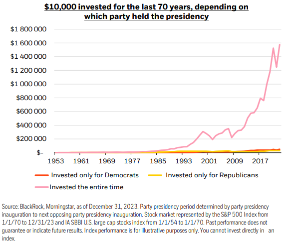 - They key has been to stay invested, as limiting our time in markets to when only one party or the other is in power has led to disastrous long-term results.