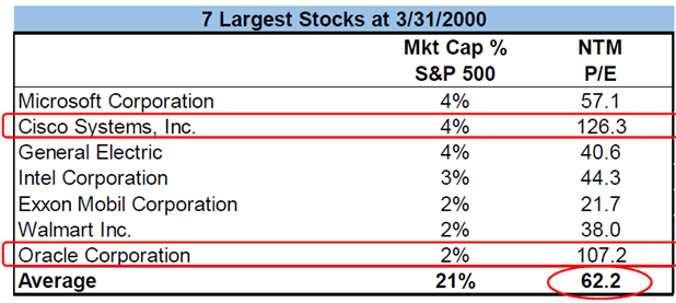 The author did concede that that U.S. stocks are pricing in a lot of good news, but comparisons to the year 2000 seem wide of the mark. 25 year ago there seemed no price too high to pay for a good growth story, as illustrated by the table below comparing the largest seven stocks in 2000 versus today.