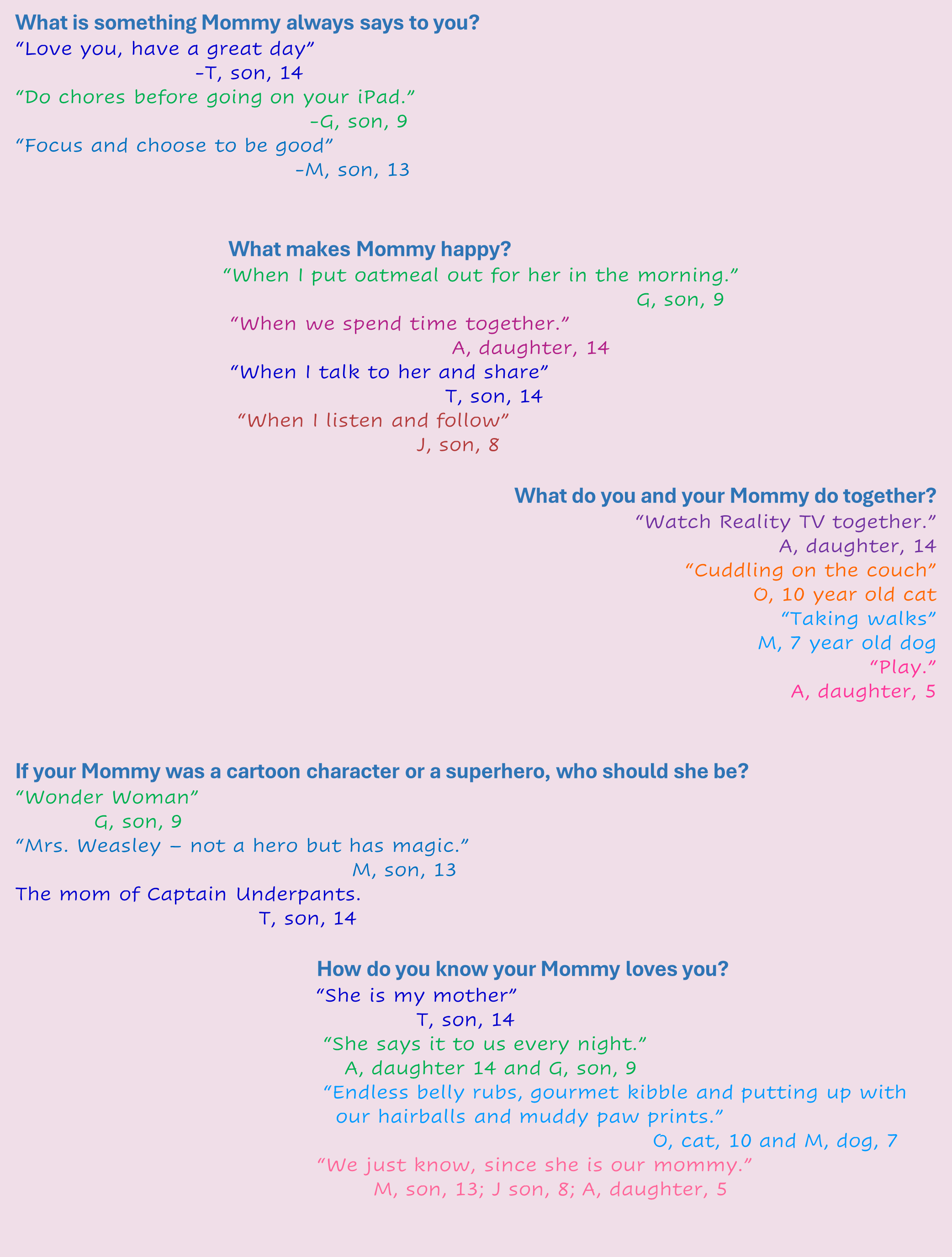 In the hearts of children, mothers hold a special place. They are the superheroes of everyday life cherished for their endless love and remarkable qualities. What do kids say about their moms? From the humorous to the heartfelt, their words paint a beautiful portrait of a mom’s love. This Mother’s Day and every day, lets celebrate these incredible women through the words of the little ones, not so little ones and furry ones who adore the women in this team.