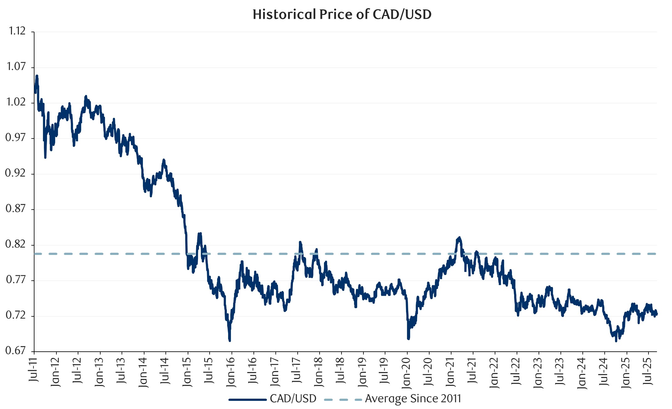 We remember a time many years ago when we entered back into the U.S. equity market after having outsized exposure to Canadian investments. In late 2011 to early 2012 following the U.S. sovereign debt downgrade from its coveted AAA credit rating by Standard & Poors, U.S. large-capitalization equities were trading at very cheap valuations after having a near “lost decade” of no returns. At the same time, the CAD and the USD were trading at par with one another. Fast forward to today and strong returns have been realized in U.S. equities where the large-cap market is now trading at over 22x forward earnings – compared to the Canadian equity market trading at a discount of approximately 26.8%. U.S. equity market performance and exposure to the USD has led to enhanced returns for Canadian investors over a near 15-year time period. However, more recently, we have experienced a small reversal in this trend where the CAD has appreciated by +4.2% relative to the USD in 2025 and the weakness in the USD has translated negatively when performance results for U.S. assets are measured and reported in CAD. In this special report, we provide some perspective to the recent currency dynamics, and review how we evaluate foreign currency exposure as it relates to our portfolio construction process.