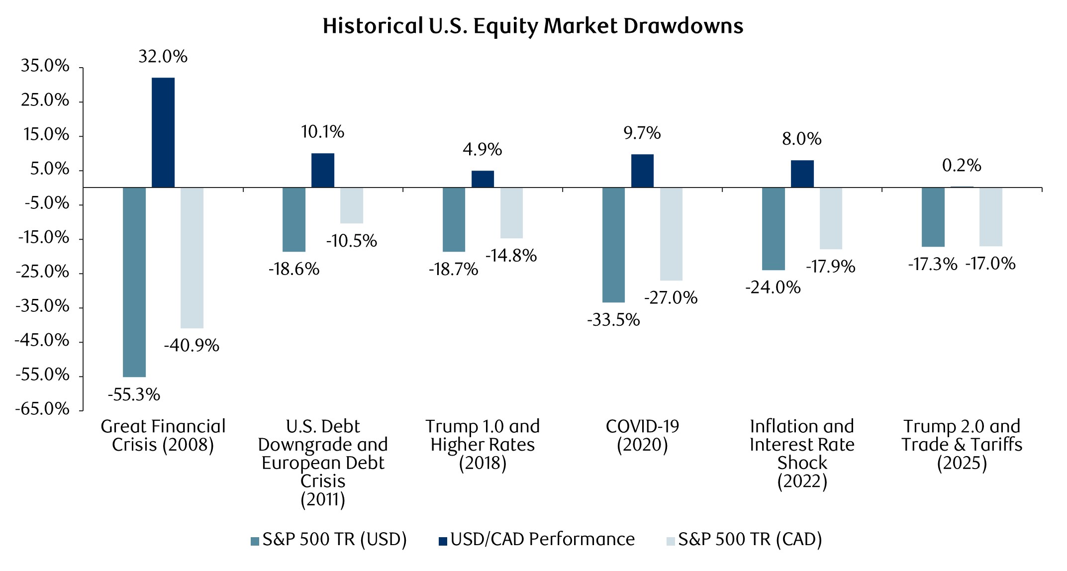 Figure 3 quantifies the USD’s historical role in mitigating drawdowns. In all six periods, USD appreciation reduced losses for Canadian investors by an average of 10.8%, with only the 2025 tariff-related event showing minimal protection. Theories for this anomaly in 2025 include concerns over growing U.S. debt and foreign investors hedging USD positions.