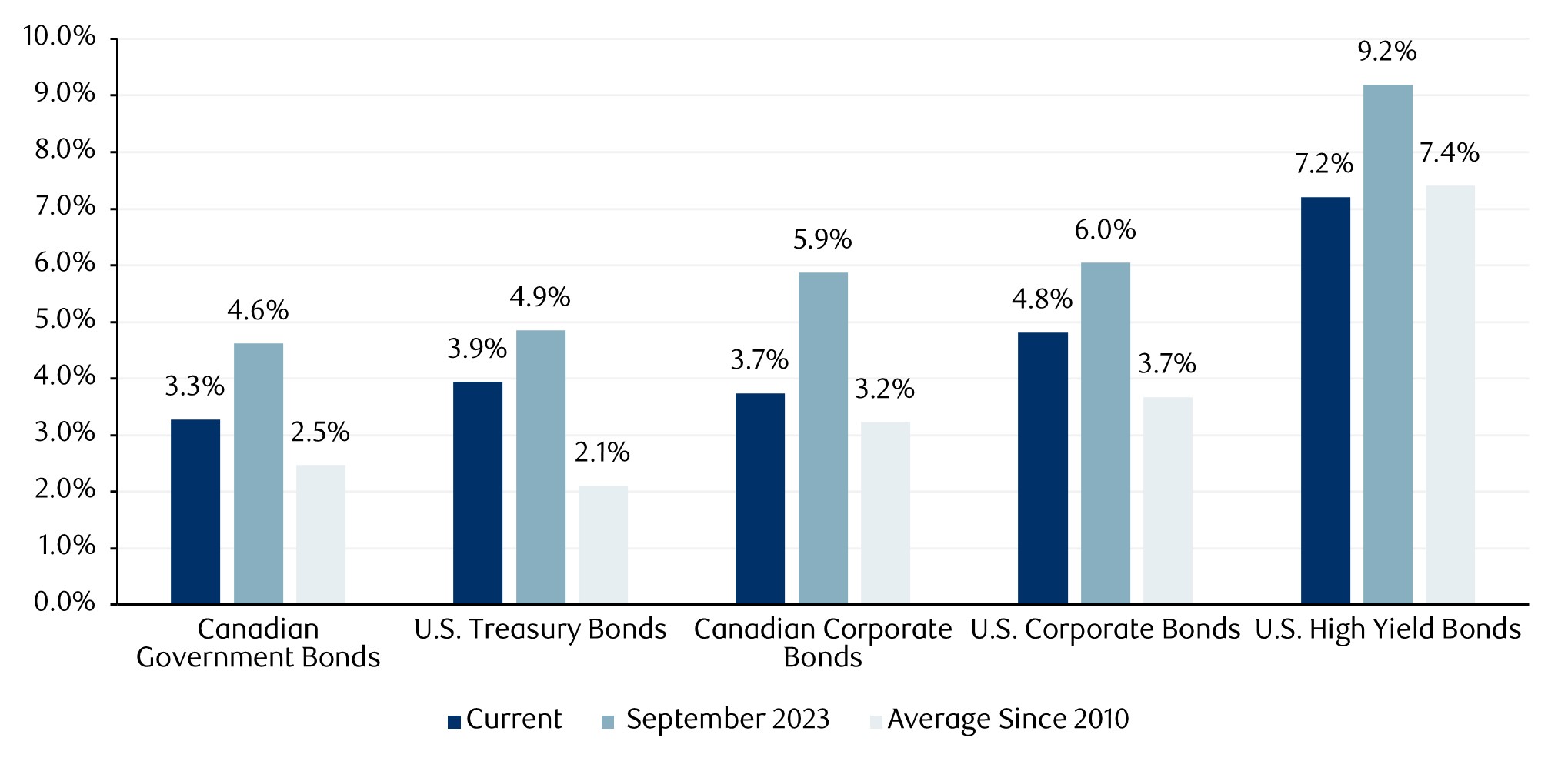 Source: RBC Wealth Management, Bloomberg. Current yield data presented as of September 30th, 2025. “Average Since 2010” yield presented from December 31st, 2009 – September 30th, 2025. Canada Sovereign Bonds represented by the Bloomberg Canada Government Bond Index. U.S. Sovereign Bonds represented by the Bloomberg U.S. Treasury Bond Index. Canada Corporate Bonds represented by the Bloomberg Canada Corporate Bond Index. U.S. Corporate Bonds represented by the Bloomberg U.S. Corporate Bond Index. U.S. High Yield Bonds represented by the Bloomberg U.S. High Yield 1-5Y Bond Index.