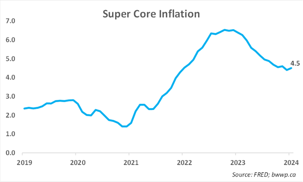 Unlike Canada, where the course appears to be set for an interest rate cut by the Bank of Canada in the next couple of months, the U.S. continues to deal with inflation that remains stubbornly high. Let’s look at a chart and then comment: