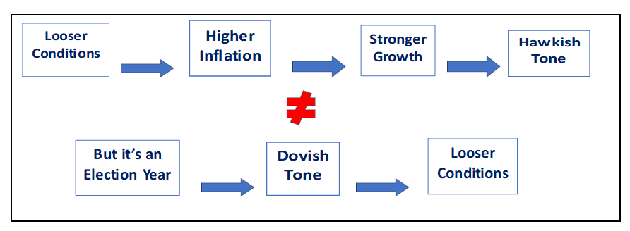We have discussed some of this in the past – because most mortgages in the U.S. are done at a 30-year fixed rate and because most corporations have termed out their debt, the U.S. economy is simply not that sensitive to rates – at least in the short to intermediate term. Thus, while the Fed can hem and haw about keeping rates high unless inflation comes down, the impact of its rhetoric on the economy is somewhat muted. Add to this that the U.S. is in an Election Year and the Fed has generally adopted the mantra of – thou shall not interfere in an Election Year to any great extent. Further, while the Fed did a good job of tightening financial conditions in 2022 with 500 basis points of hikes and a fair bit of hawkish rhetoric, conditions have loosened quite a bit of the past year with overall conditions close to neutral at the present time:
