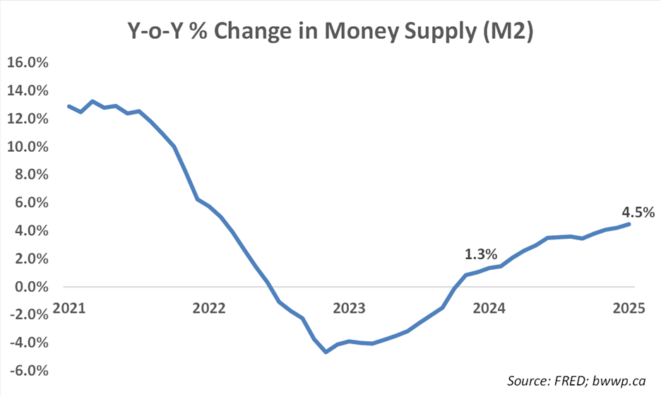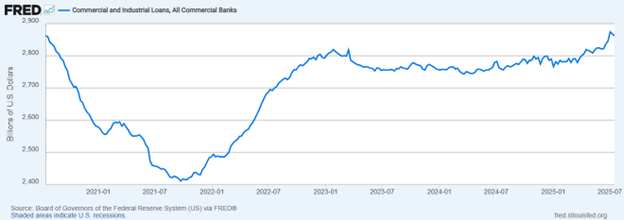 As you can see from the far right side of the chart, despite all of the uncertainty around tariffs, loan growth has surged in the early part of 2025. Loan growth feeds directly into M2 and is indicative that growth is likely to pick up (more investment means more growth).