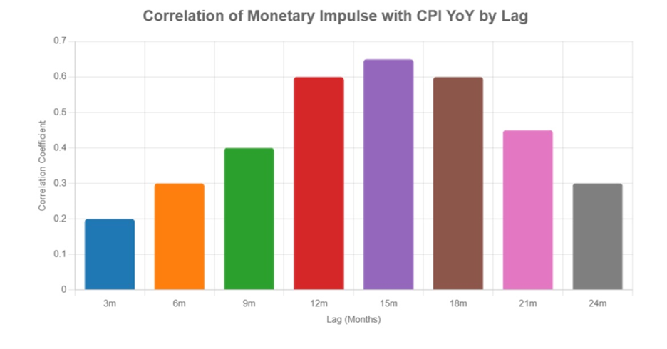As you can see, the strongest correlation is at around 15-months. In other words, a change in growth rate of M2 (this is defined as The Monetary Impulse in the chart below*), would likely be reflected in inflation data sometime around September of 2026.