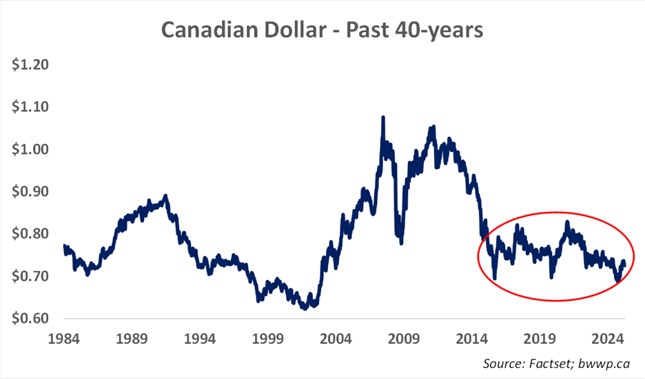 Over the last decade, the Canadian dollar has been between $0.70 and $0.80 more than 90% of the time. When one considers all of the events that have occurred over this period from negative oil prices during COVID to prices above $100/boe at the start of the Russia/Ukraine war; to tariffs and the resultant economic uncertainty; to COVID and the global uncertainty that it brought about, the “resiliency” of CAD is both impressive and speaks to a larger narrative – fair value for the Canadian dollar, despite some historic indicators that suggest otherwise, seems to have found an equilibrium relative to the U.S. dollar.