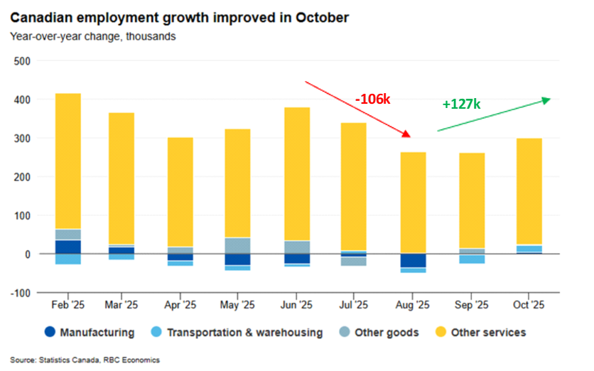 First, the jobs market, which lost more than 100k jobs over the summer, has seen a nice rebound over the past two months to the tune of more than 125k net jobs created. The two biggest beneficiaries were trade and manufacturing, which also happened to be the areas that took the biggest hits in the wake of Liberation Day. Add to this a modest recovery in GDP growth and the Canadian economy appears to be on firmer footing as we head into 2026. While we had hoped to see more from the budget (more below), we remain cautiously optimistic that the worst is behind the Canadian economy and the next four-quarters will bring improvement.