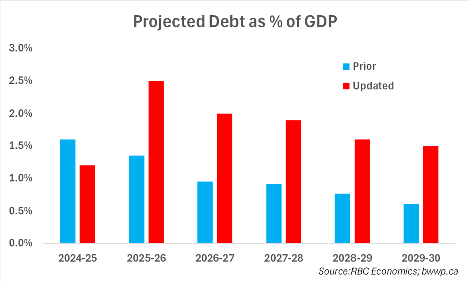 The Canadian budget was big on new debt with projected annual debt-to-GDP ratios rising throughout the next five years vs. prior forecasts. In all, there was $178 billion of new spending in the budget, offset by $42 billion of savings, bringing the net new spending to $126 billion. The prior goal of bringing down debt-to-GDP was largely abandoned as it is expected to remain at around 43% over the forecast period. Now, we have harped for some time on the need for Canada to invest more in the economy and this budget endeavors to do so to the tune of ~$32 billion through 2029-30. However, this still leaves another $94 billion of new spending that is not geared toward investment, which continues a worrisome 10-year trend. Overall, here is how we would break it down: