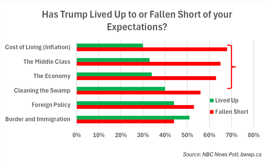The above is from a poll conducted by NBC News at the end of October of registered voters across the U.S. While Trump “met expectations” on the issue of the border and immigration, he is deeply “underwater” as it relates to issues of the economy, helping the middle class and most importantly – inflation. Now, returning to “the narrative”, one of the hallmarks of Trump 1.0 was that while he was generally unpopular overall, his ratings on the economy were almost always favorable. In fact, were it not for Covid (we realize this is a bit like saying “were it not for THAT, Mrs. Lincoln, how was the show?”), it is entirely possible that Trump would have cruised to reelection in 2020 as a strong economy is generally the strongest driver of election results.