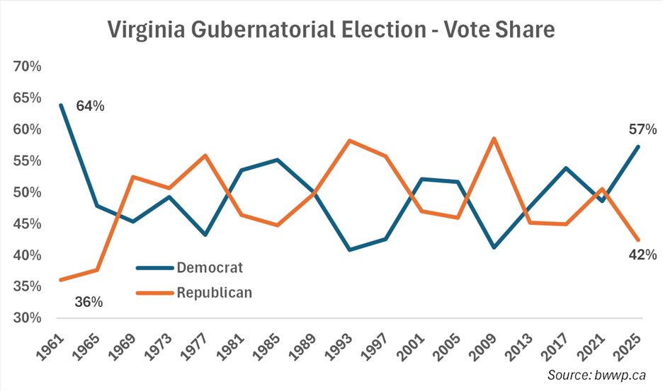 Okay, let’s now focus a bit on the actual results of the election to see if we can get any sense of what 2026 might look like. We will begin with Virginia, which had a term-limited Republican governor (governors are only allowed to serve one term in Virginia, which is strangely refreshing). Kamala Harris won Virginia in 2024 by about 3-points and Democrat Abigail Spanberger was expected to win last week with most polls putting her 5-6-points ahead. Let’s look at another chart and then comment: