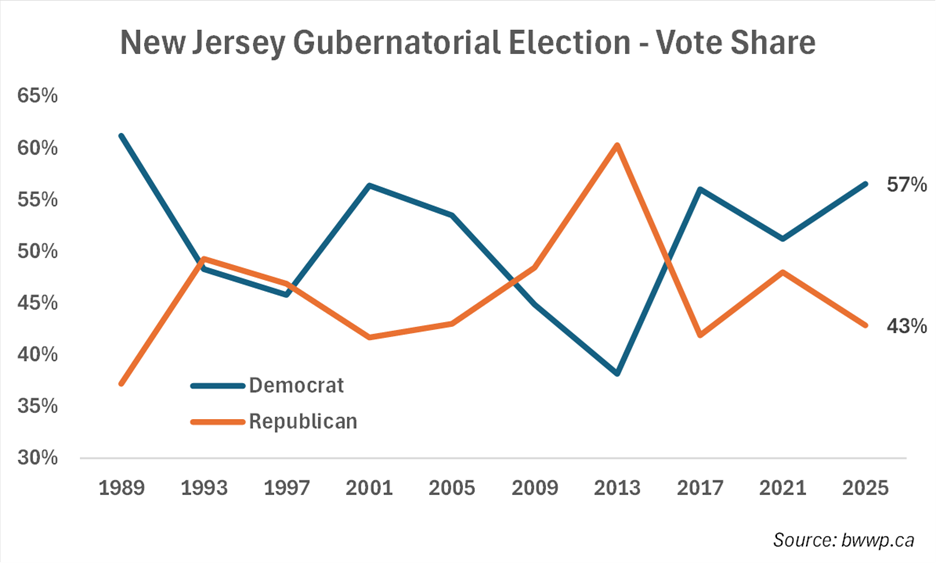 Now, you hear much talk in the U.S. media about “wave elections” where one party has so much momentum that they see gains almost across the board and these gains even upend races in which the other party was thought to be safe. The most famous example of this was the 1994 election when the so called “Republican Revolution” saw the GOP pick up 54-seats in the House of Representatives, eight Senate seats (giving them joint control of Congress for the first time in more than 40-years), ten governorships and a majority of state legislatures. Last week probably fell short of the standard of a wave election as there were really only two states in play, but considering the Democrats won both gubernatorial races by wide margins, netted 13-seats and 5-seats respectively in the Virginia and New Jersey state legislatures, and saw California’s redistricting effort (more on this in a moment) pass easily and the GOP should at least be concerned that things do not augur well for 2026.