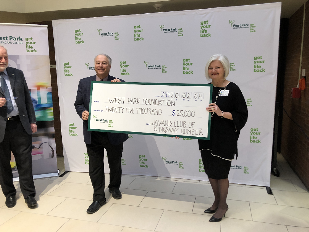Barnaby presents cheque on behalf of The Kiwanis Club of the Kingsway for $25,000.00 to CEO of West Park Hospital to be used to equip and furnish a children's play area in the new hospital. West Park Hospital is a leader in rehabilitation.