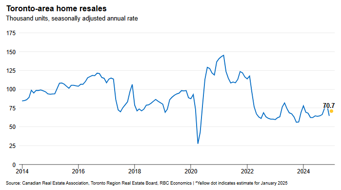 Toronto’s housing market bounced back in January with resales jumping a seasonally adjusted 10% from December. This lends credence to our view that the 19% dip at the end of 2024 didn’t mark a turning point, but was a bump on the long (and winding) road to recovery.