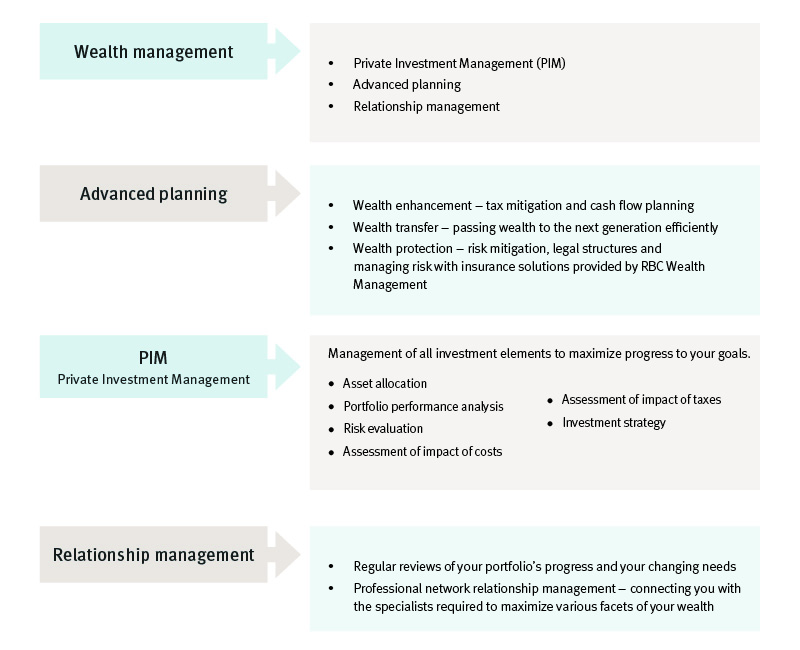 Investments are an important facet of financial planning but tax and estate planning are also critical to preserving your family's wealth and building your legacy. We engage the services of both internal and external professional advisors in the areas of taxation, legal counsel, estate planning and insurance. We provide advanced tax and estate planning services to business owners, executives, professionals and family stewards through RBC Wealth Management specialists.