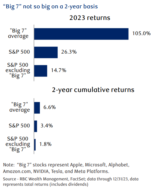A large part of the growth came from the U.S. market where the Magnificent Seven stocks (Apple, Microsoft, Google, Amazon, NVIDIA, Tesla and Meta) really drove the US market contributing over 2/3 of the total return in the S&P500. When you step back and consider the fact that 7 companies accounting for over 2/3 of the return of a 500 stock index it was truly a unique year. On average, these companies were up 105% in 2023. Over a two year period these high performing stocks have achieved a more modest 6% return. Although we like the prospects for a lot of these companies, valuations are definitely a consideration.