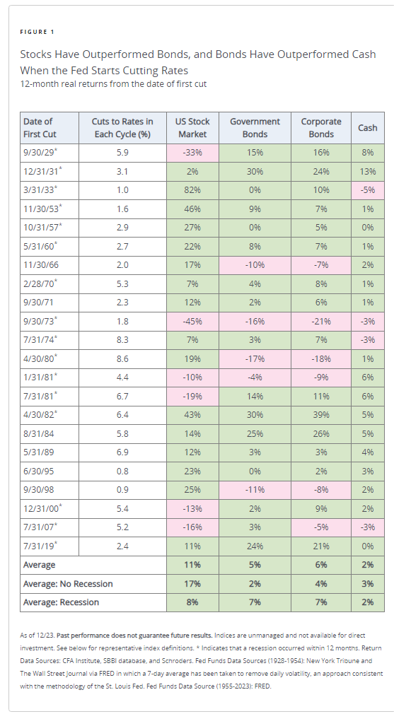 Federal Reserve rate cuts are a positive for markets. In the 12 months following a Fed rate cut the average return in the U.S. market has been 11%. Rate cuts are often viewed as a wind at our back which bodes well for returns over the coming year.