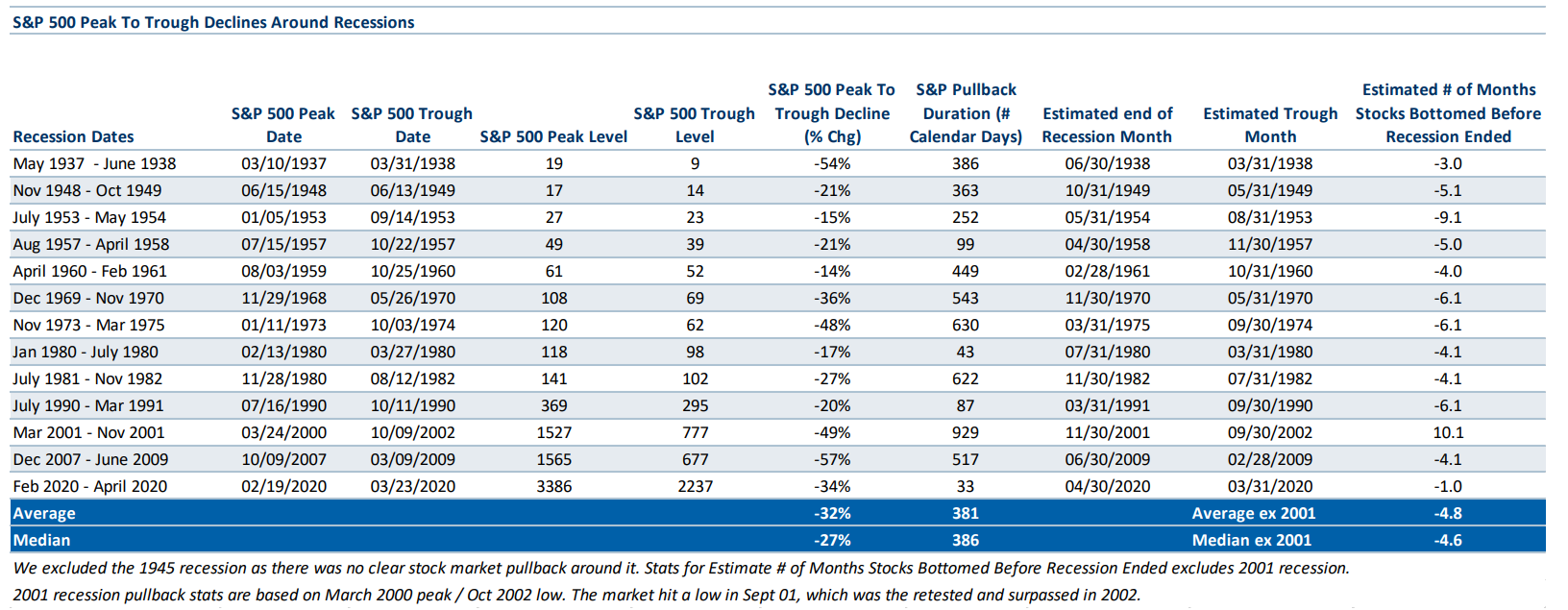 Lorsque les craintes liées à la croissance s'avèrent légitimes, le S&P 500 a tendance à perdre entre un quart et un tiers de sa valeur. Il s'agit là d'une indication approximative. Depuis la fin des années 1930, les baisses du S&P 500 liées à la récession ont varié de 14 % à 57 % entre le pic et le creux, avec une baisse moyenne de 32 % et une baisse médiane de 27 %.