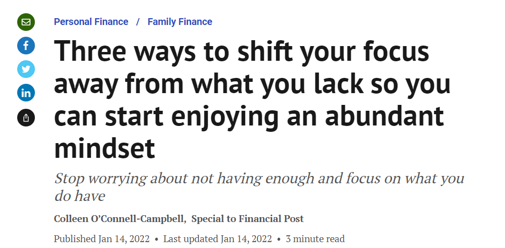 I shared my thoughts on shifting your mindset from lack to abundance The article was published in the Financial Post (January 14, 2022). https://financialpost.com/personal-finance/family-finance/three-ways-to-shift-your-focus-away-from-what-you-lack-so-you-can-start-enjoying-an-abundant-mindset...