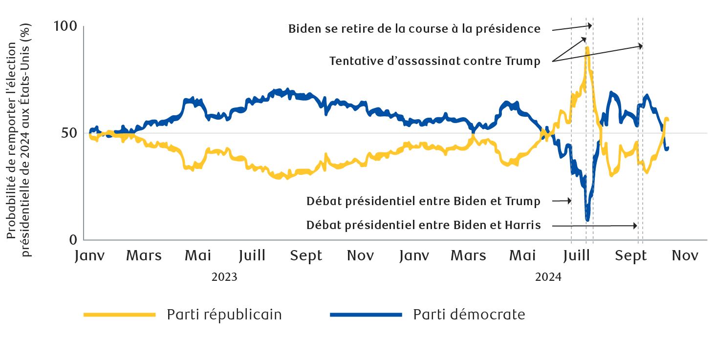 Les raisons sont difficiles à déterminer avec précision, mais selon nous, Mme Harris peine à envoyer un message clair aux électeurs, en particulier sur des questions comme l’inflation et l’économie. Le récent débat entre les candidats à la vice-présidence n’a pas réussi à renforcer le message de Mme Harris ni à faire progresser la candidate dans les sondages, mais il est vrai que ce débat n’a généralement guère d’incidence sur l’issue du scrutin. De plus, certains observateurs affirment que les deux ouragans qui ont dévasté la côte du golfe du Mexique et leur gestion par l’administration actuelle ont porté préjudice au parti sortant. Enfin, le risque géopolitique reste au cœur des préoccupations de nombreux électeurs, certaines factions considérant le conflit du Moyen-Orient comme l’enjeu le plus important des prochaines élections.