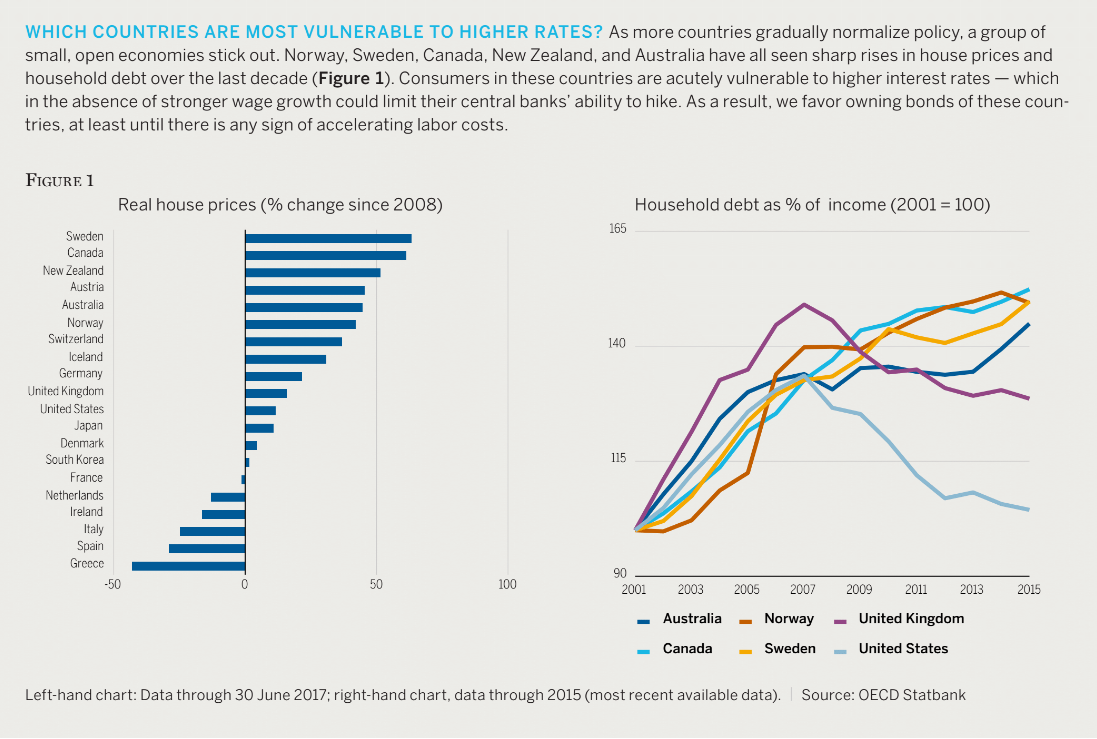Rising interest rates, lower tax rates, and robust economic growth is a near-perfect combination for US bank stocks. Although the sector performed well through 2017, valuations still leave ample room for upside in the new environment. I would encourage reviewing the opportunities that we looked at in the sector back in Q1/Q2 2017. By contrast, Canadian bank stocks remain fully valued and generally do not have the same tailwinds (although CIBC’s purchase of Private Bancorp and RY’s purchase of City National now both look very timely). At the risk of sounds like Chicken Little, I will highlight that Toronto-area housing prices fell yet again last month, and in this rising rate environment, Canadian consumers remain the most indebted of all developed nations (see “OECD” attached).