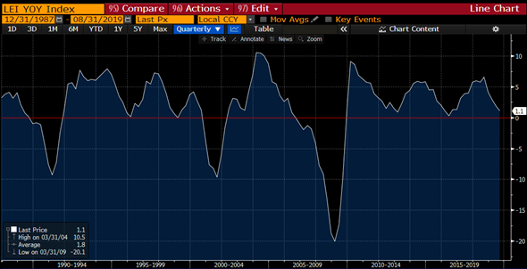 The final few words in that question are a bit bold, but they are also what September has helped to clarify. A quick glance at the index of US Leading Indicators (chart below) shows the strong signaling effect that the index has for stock market declines and recessions. One can pretty easily eyeball that when the index has fallen to zero or lower over the past 30 years, the date ranges are painfully familiar to investors: 1990 (recession), 2000 (Tech Bubble), 2008 (Financial Crisis), 2012 (Euro Debt Crisis), 2015/16 (Yuan devaluation, crude sub-$40). After including this month’s data, we are now almost back at this important zero level.