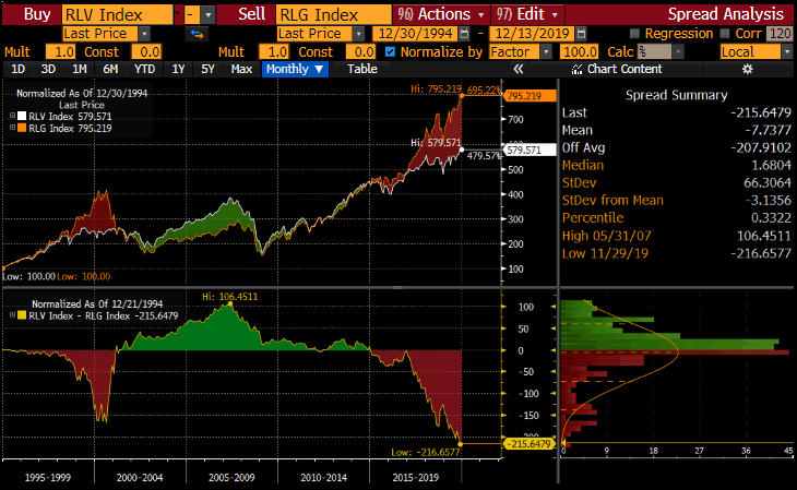 Relative Performance: Russell Value vs Growth indexes, 1995 – 2019 (normalized as of Dec 30, 1994)