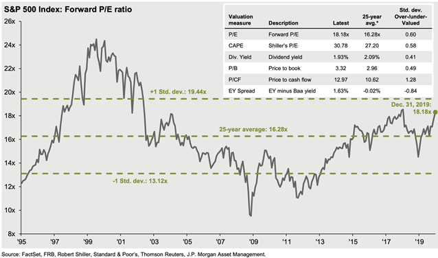 S&P 500 Forward P/E, 1995 – 2019 (chart) & other popular valuation measures (table)