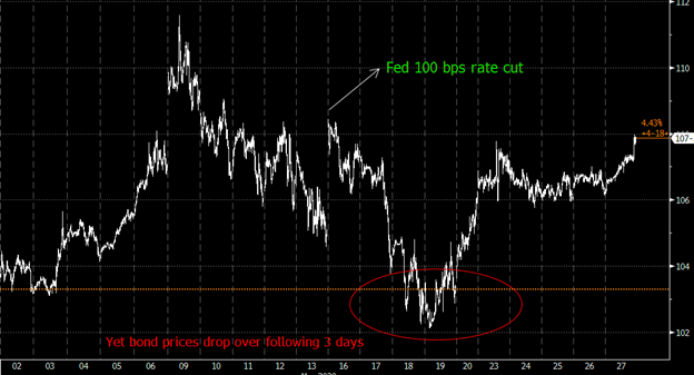 Earlier in March, market volatility triggered certain investment strategies to contribute to a partial feedback loop, where lower equity prices catalyzed further selling in order to reduce risk (discussed in the previous update). Ironically, the Fed’s subsequent response to a slowing economy by aggressively cutting interest rates two Sundays ago caused that equity market correction to escalate into a short-term liquidity crunch across all assets.