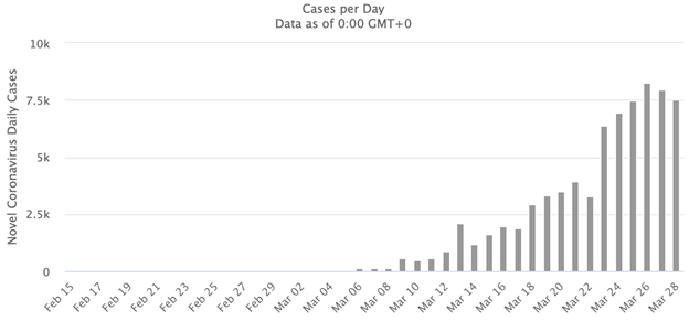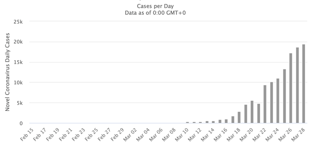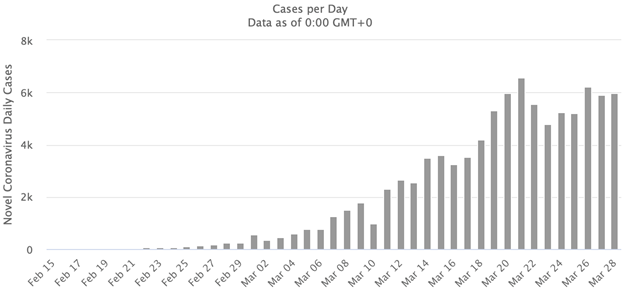 On that note, while I am obviously not an epidemiologist, infection data (the storm) seems to be showing a clear deceleration in growth. There are new cases every day and that could lead to some terrible individual consequences and frightening headlines, but the flat-lining in growth of new cases seems quite apparent and is presumably a positive for society as a whole. Note the change in trajectory over recent days in the following charts: